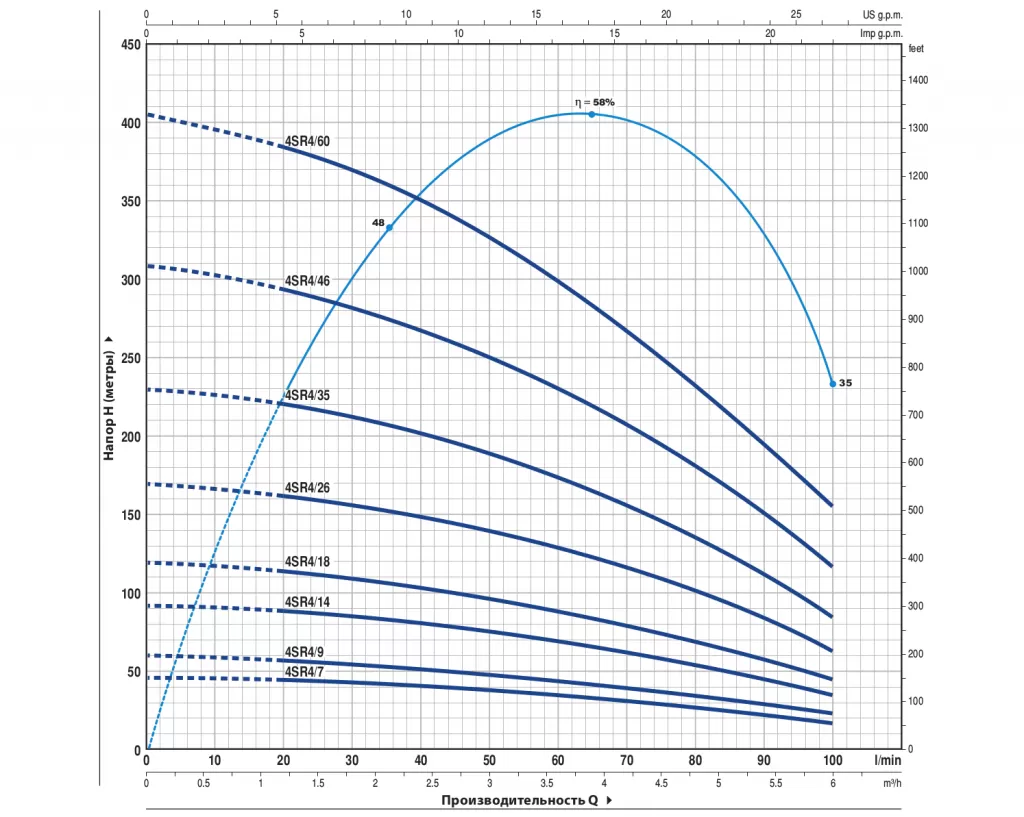 Глубинный насос Pedrollo 4SR4/26-P, отличается объективной ценой и надежной работой всех исполнительных механизмов. Насос Pedrollo 4SR4/26-P достаточно простой в эксплуатации и обслуживании, поэтому отлично подходит как для домашнего, так и промышленного применения.В основе работы Pedrollo 4SR4/26-P лежит конструктивно простой, но функционально успешный многоступенчатый центробежный принцип. Электрический двигатель подключается к агрегату через суппорт, в соответствии с нормативами международного стандарта NEMA. Мощность электродвигателя насоса составляет 2200 Вт . И при таких показателях мощности насос обладает максимальным напором в 170 метров и максимальной производительностью 6 м3/час. Функционирование Pedrollo 4SR4/26-P идентично большинству устройств, основанных на центробежных механизмах подачи воды. Жидкость втягивается в корпус устройства благодаря центробежной силе, создаваемой рабочими колесами, которые также проталкивают воду через все тело насоса "диаметр насоса 4"", а затем в нагнетающий патрубок "диаметр патрубка 1¼"", через который вода и попадает к конечному потребителю. Главной особенностью насоса Pedrollo 4SR4/26-P является малый диаметр корпуса агрегата, а также то, что перекачиваемая вода не касается стенок двигателя. Между жидкостью и корпусом движущей установки располагается прослойка из технологического масла, которая и предотвращает попадание мелких частиц непосредственно в исполнительный механизм. В то время как охлаждение электропривода происходит за счет верхнего способа забора воды, т.е. перекачиваемая жидкость находится всегда выше уровня расположения двигателя. Насос питается от сети в 380 в и комплектуется кабелем 1.5 метров.