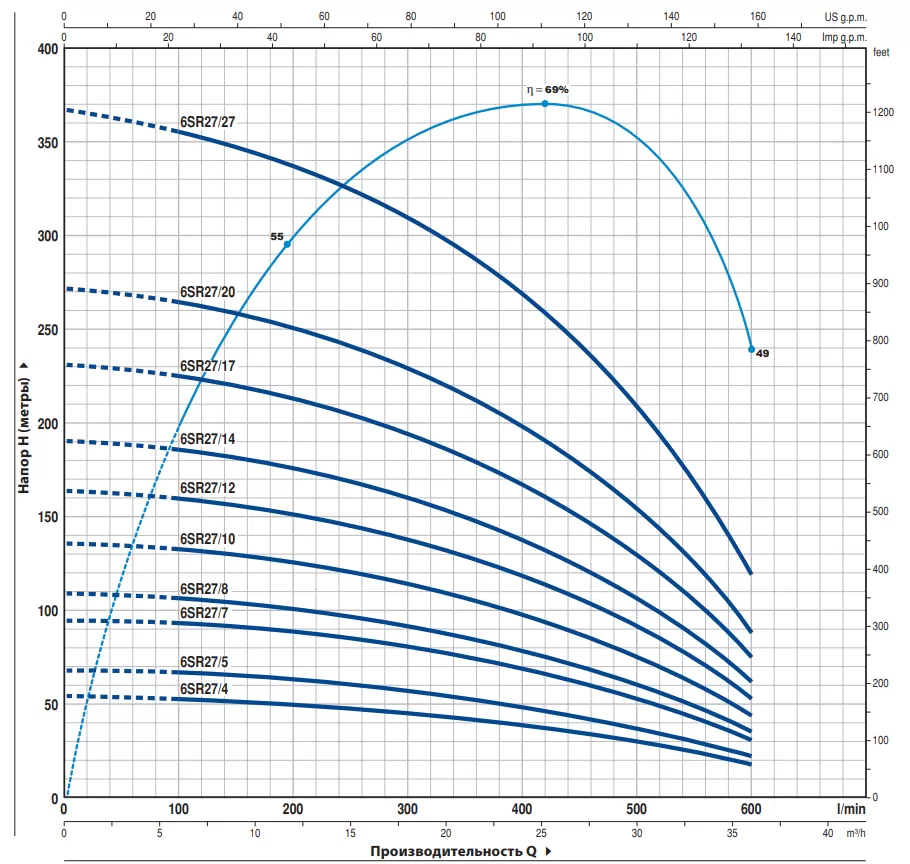 Глубинный насос Pedrollo 6SR27/14-P, отличается объективной ценой и надежной работой всех исполнительных механизмов. Насос Pedrollo 6SR27/14-P достаточно простой в эксплуатации и обслуживании, поэтому отлично подходит как для домашнего, так и промышленного применения.В основе работы Pedrollo 6SR27/14-P лежит конструктивно простой, но функционально успешный многоступенчатый центробежный принцип. Электрический двигатель подключается к агрегату через суппорт, в соответствии с нормативами международного стандарта NEMA. Мощность электродвигателя насоса составляет 15000 Вт . И при таких показателях мощности насос обладает максимальным напором в 191 метров и максимальной производительностью 36 м3/час. Функционирование Pedrollo 6SR27/14-P идентично большинству устройств, основанных на центробежных механизмах подачи воды. Жидкость втягивается в корпус устройства благодаря центробежной силе, создаваемой рабочими колесами, которые также проталкивают воду через все тело насоса "диаметр насоса 6"", а затем в нагнетающий патрубок "диаметр патрубка 3"", через который вода и попадает к конечному потребителю. Главной особенностью насоса Pedrollo 6SR27/14-P является малый диаметр корпуса агрегата, а также то, что перекачиваемая вода не касается стенок двигателя. Между жидкостью и корпусом движущей установки располагается прослойка из технологического масла, которая и предотвращает попадание мелких частиц непосредственно в исполнительный механизм. В то время как охлаждение электропривода происходит за счет верхнего способа забора воды, т.е. перекачиваемая жидкость находится всегда выше уровня расположения двигателя. Насос питается от сети в 380 в и комплектуется кабелем 4 метров.